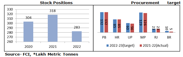 Government has wheat stocks of around 283 lakhs metric tonnes with the central pool at the end of this month. Stocks are almost 35 LMT is lower compared to last February '21. The Government of India has decided to keep Minimum Support Prices of Wheat @ Rs. 2015/quintal. To ensure sufficient stock centre has announced that it would buy 44.4 million tonnes (MT) of wheat during rabi marketing season 2022-23. Last year's total procurement was 43.34 million tonnes.