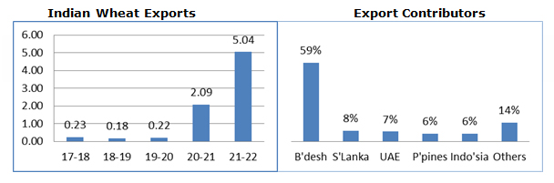 Bid spike has been seen in the export of wheat in current financial year (Data in below chart considered till Dec' 21) as the major factors that supported the Indian wheat export numbers includes high MSPs, ample domestic supplies, tighter exportable supplies from competitors, and strong global demand, including from neighbouring countries. Harvesting season - 2021/22 was a bumper production year and burdensome government stocks for wheat were only partly offset by generous distributions through the public distribution system. Indian wheat exports are likely to rise to a record high of between 6.5 to 7 million tonnes (mt) this fiscal on the back of good demand for countries in South Asia and South-East Asia regions. The US Department of Agriculture expects India to ship around 6.50 million metric tonnes during MY 2021-22